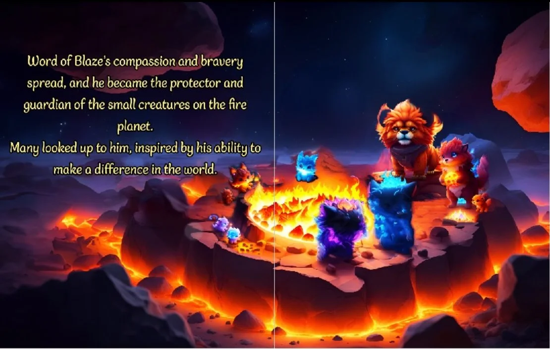 The story is about the creature Blaze, who looks like a mix between a dog and a lion and lives on Fire World. Blaze is a Fury, whose job it is to assist the intelligent Fireborns in guarding and protecting the planet. However, the king is planning a new structure, Wealthy Rock, which is supposed to ensure the prosperity of the fire planet, but does require the relocation of some smaller, less significant creatures, or so the king thinks. Blaze, however, can connect to the planets and the creatures and stops his fellow Fury’s from capturing those creatures. Eventually they and the king understand that even the smallest of creatures is important and shouldn’t be treated in this way and jointly they find a new solution that benefits all.